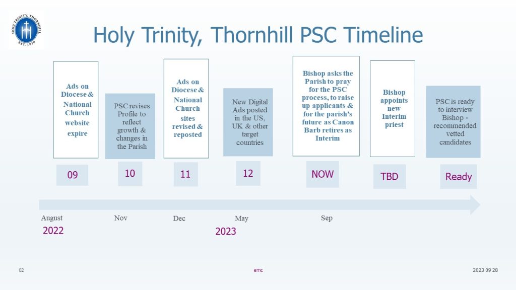 The flow chart below, with dates superimposed, gives you a sense of the activities and timelines involved. The Parish Profile was finalized on April 13, 2022, and circulated on the Diocesan and National Church websites. It was further up-dated earlier this year with the addition of virtual testimonials – most recently one from Canon Barb is being added (see our website). We have reached out digitally with ads in the US and the UK. We have met regularly with our coaches as well as with Bishop Andrew. But, as noted last November, things did not go according to plan. The situation we find ourselves in is not unusual. A large number of clergy are retiring, and fewer new priests are coming up. Churches were emerging from COVID and were in a fragile condition. As a result, some priests who might otherwise be interested in the opportunity at Holy Trinity Church were reluctant to leave their parishes.