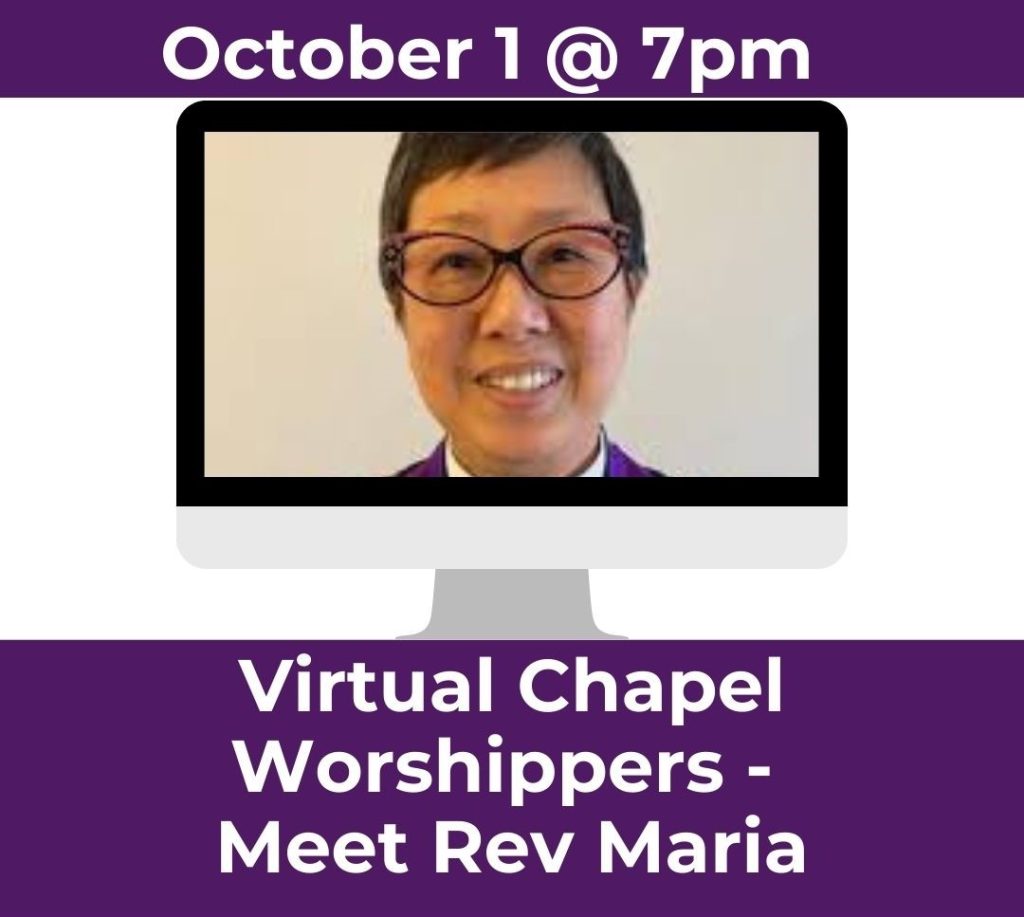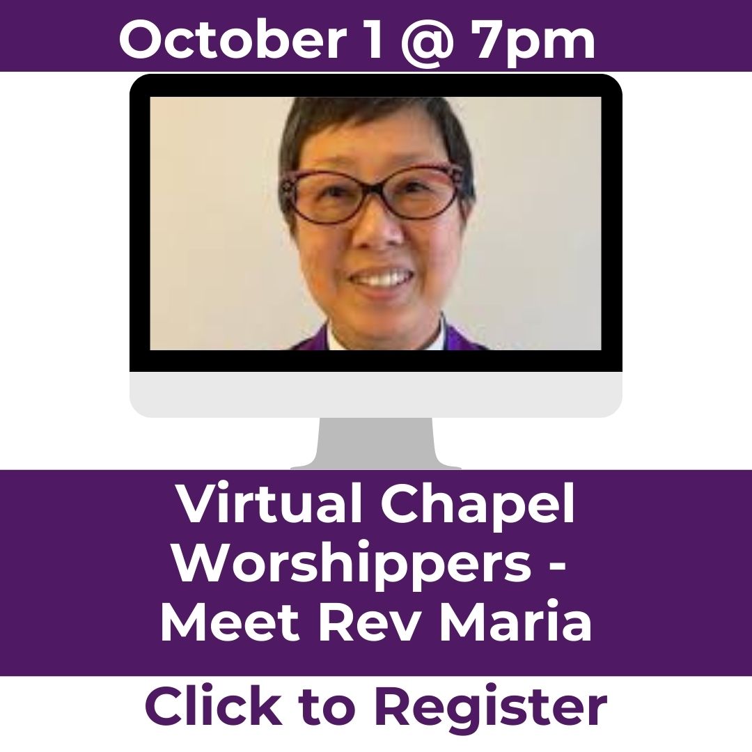 Virtual Chapel Worshippers Meet and talk with Rev. Maria Ling on October 1, 2024 @ 7:00pm. Talk with Rev Maria – Register Here